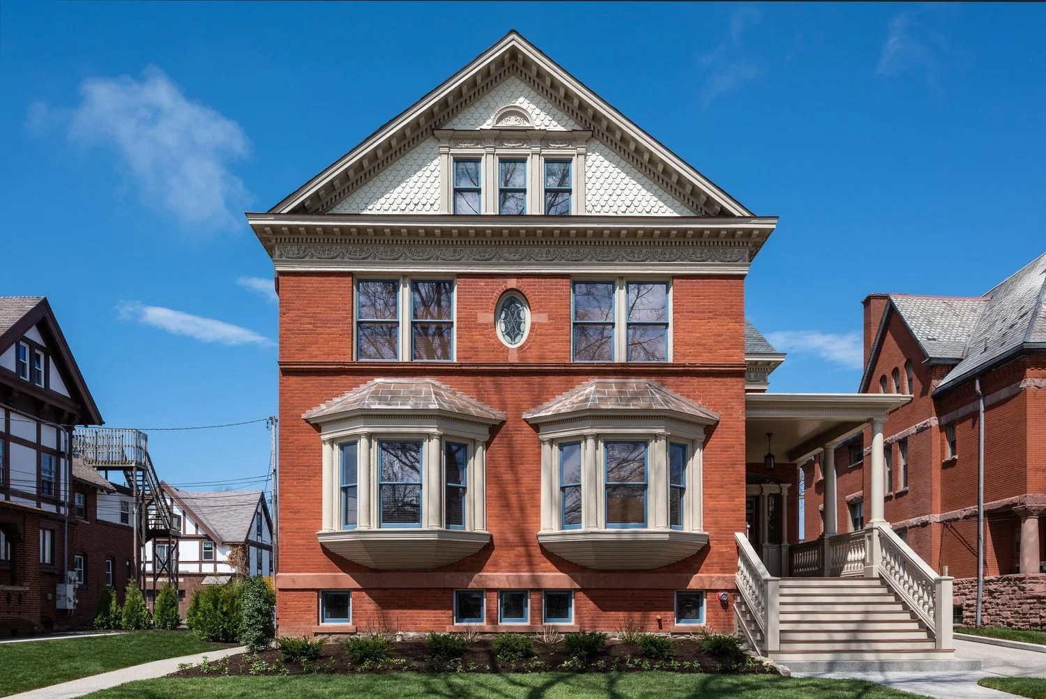 This project involved extensive masonry restoration and cleaning, roof repair, window replacement, painting and landscaping. Significant interior renovation work and modifications were required in addition to major structural and foundation repair. Additional work included painting, extensive woodwork restoration and repair, replacement of all flooring and finishes, improved accessibility, and all new electrical, HVAC, plumbing, and sprinkler system. The project also included renovation of a two-story garage behind the house into a one-bedroom apartment with access to the garage below.